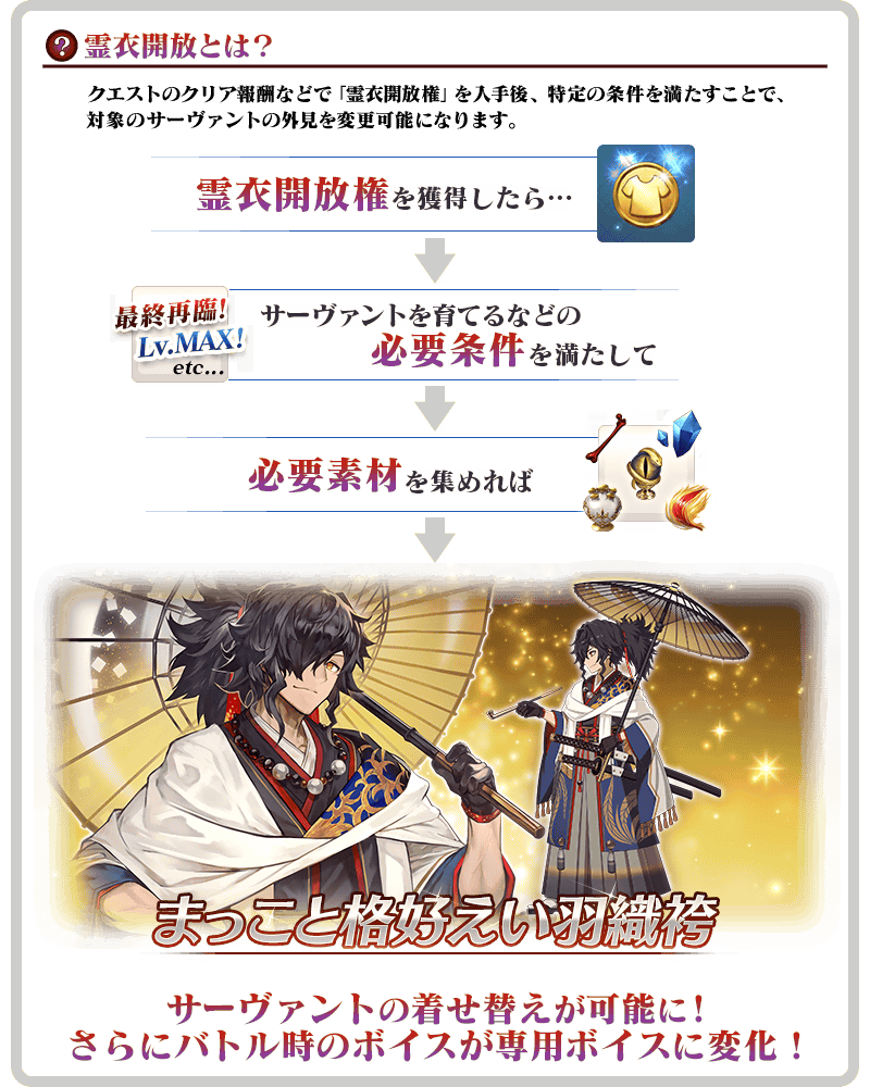 ※「霊衣開放」後は自動でバトルキャラやフェイス画像が切り替わります。「霊衣開放」前の状態に戻したい場合や、他の再臨段階に変更したい場合は、サーヴァント詳細画面より変更することができます。 ※「霊衣開放」をおこなってもクラスやパラメータなどに変化はありません。