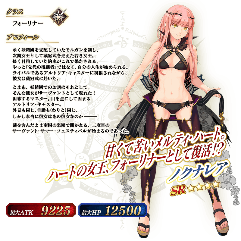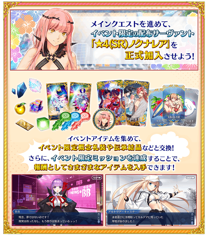 ※本ページの画像はすべて開発中のものです。実際の画像とは異なる場合があります。 ※2019年1月1日(火) 0:00以降に新たに配信されるメインストーリー、期間限定イベント、一部クエスト、キャンペーンおよび召喚では、真名隠し対象サーヴァントの真名が表示されます。 ※一部のクエストは後日開放されます。 ※「★4(SR)ノクナレア」は、イベント開幕直後に開放されているメインクエストをクリアした段階では仮加入しませんのでご注意ください。 ※「★4(SR)ノクナレア」は、ゲーム内では表示される名称が異なります。