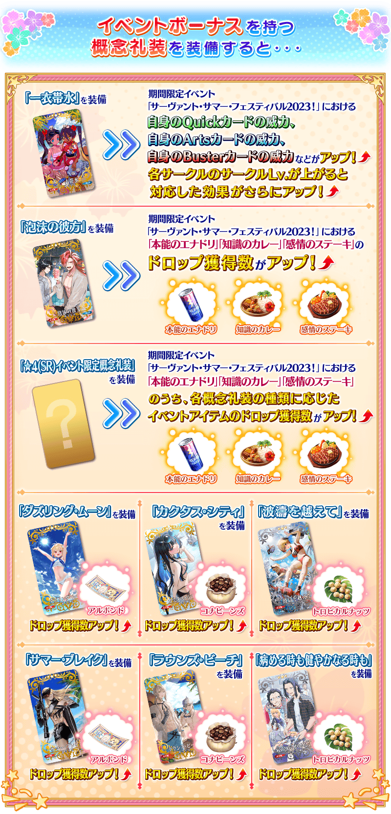イベントの進行で複数種の★4(SR)のイベント限定概念礼装を入手できることがあり、装備することでイベントアイテム「本能のエナドリ」「知識のカレー」「感情のステーキ」のうち各概念礼装の種類に応じたイベントアイテムのドロップ獲得数がアップします。