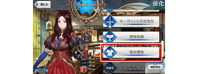 ※「霊衣開放」後は自動でバトルキャラやフェイス画像が切り替わります。「霊衣開放」前の状態に戻したい場合や、他の再臨段階に変更したい場合は、サーヴァント詳細画面より変更することができます。 ※「霊衣開放」をおこなってもクラスやパラメータなどに変化はありません。