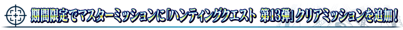 下記の期間中、「マスターミッション」の「限定」タブ内に、期間限定で「【ハンティングクエスト 第13弾】限定ミッション」が追加されます。