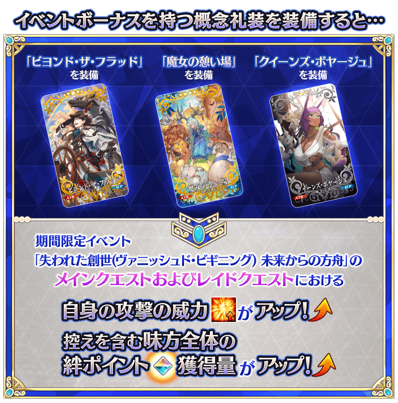 聖晶石召喚にてピックアップされる期間限定概念礼装「★5(SSR)ビヨンド・ザ・フラッド」「★4(SR)魔女の憩い場」「★3(R)クイーンズ・ボヤージュ」を装備することで、期間限定イベント「失われた創世(ヴァニッシュド・ビギニング) 未来からの方舟」のメインクエストおよびレイドクエストにおける自身の攻撃の威力と控えを含む味方全体の絆ポイント獲得量がアップします。