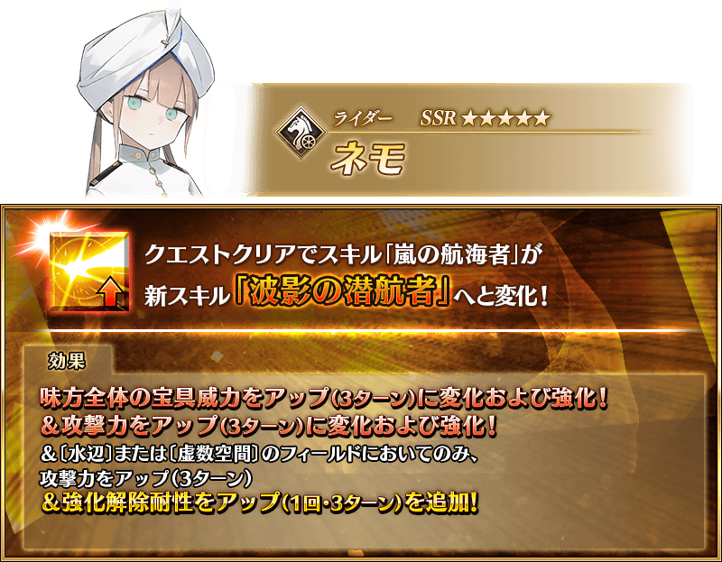 「★5(SSR)ネモ」「★4(SR)キルケー(オケアノスのキャスター)」が強化される特別なクエスト「サーヴァント強化クエスト」が、カルデアゲートに恒常的に追加されます。