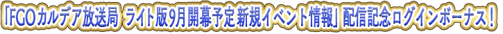 「FGO カルデア放送局 ライト版 9月開幕予定 新規イベント情報」におきまして、7万リポストを達成いたしましたので、配信記念ログインボーナスを実施いたします!