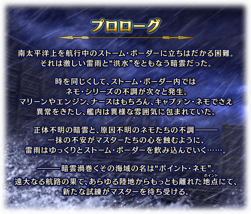 遠大なる航路の果て、暗雲渦巻く海域“ポイント・ネモ”でマスターたちを待ち受けるものとは…?