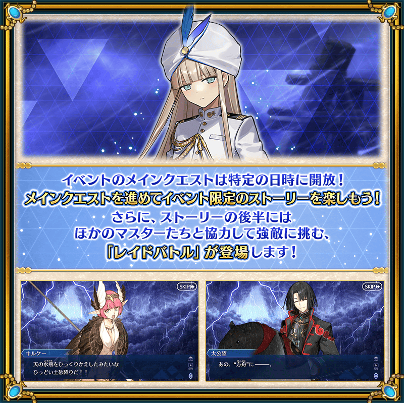 ※一部のクエストは後日開放されます。 ※「マテリアル(ギャラリー)」に本イベントのイベントCGやムービーが追加されるのは、2025年9月24日(水) 13:00からとなります。 ※本ページの画像はすべて開発中のものです。実際の画像とは異なる場合があります。 ※2019年1月1日(火) 0:00以降に新たに配信されるメインストーリー、期間限定イベント、一部クエスト、キャンペーンおよび召喚では、真名隠し対象サーヴァントの真名が表示されます。